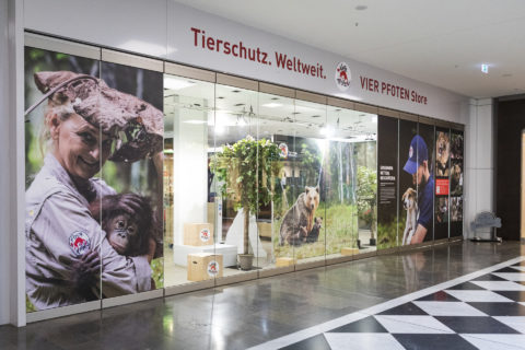 Besucher können sich auch hier auf ein eindrucksvolles Erlebnis freuen. Wie zuvor steht für die Aktion ein zentral gelegener Pop-Up-Store mit großzügiger Ausstellungsfläche zur Verfügung. Und die nutzt Vier Pfoten gekonnt aus: Bodenaufkleber im Pfoten-Format führten Interessierte wie eine Fußspur durch die Galerie.