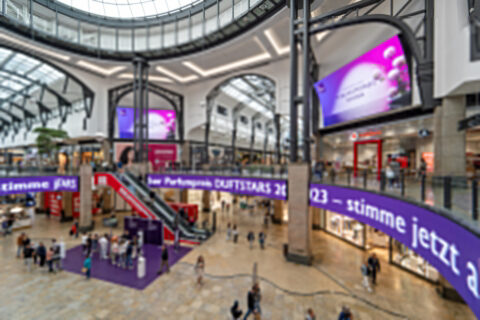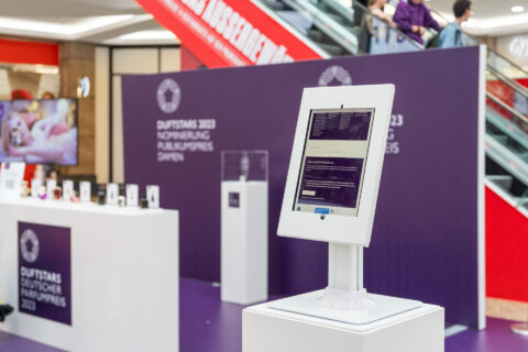 Extravagantes Lila trifft auf schlichtes Weiß: Der hochwertige Pop-Up-Stand der Duftstars 2023 war ein echter Eyecatcher für alle Besucher des Mitteldom der Flagship Shopping Destination in Oberhausen. Eine dazugehörige Medienkampagne auf dem UDS 360-Grad-Screen war das sprichwörtliche I-Tüpfelchen der Aktion und zog die Besucher nahezu magisch an.