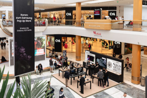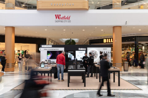 Edel sah er aus, der Pop-Up-Store von Samsung in der Westfield Shopping City Süd in Vösendorf nahe Wien, in dem die Elektronikmarke ihre Galaxy S23-Reihe vorstellte. Vom 2. bis zum 18. März 2023 baute der südkoreanische Technologiekonzern seinen Stand auf der Water Plaza auf, der lichtdurchfluteten Mittelfläche im Center. Wie schon in Deutschland, wo Samsung den globalen Launch seiner neuen S23-Serie im Westfield Centro in Oberhausen feierte, entscheidet sich Samsung auch für seine Produktpräsentation in Österreich für Standorte von Westfield. Beim Besuch in der Shopping City Süd bleibt es nicht: Vom 3. bis zum 15 April wird Samsung außerdem Halt in Wiens größtem Shopping-Center machen, dem Westfield Donau Zentrum.