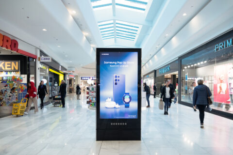 Schon von Weitem fiel Samsungs Branding in der Westfield Shopping City Süd ins Auge: Die großflächigen Deckenfahnen über der Water Plaza lenkten den Blick auf die darunter liegende Promotionfläche und animierten die Center-Besucher zum Besuch des Pop-Up-Stores. Diesen erreichten neugierige Besucher aus dem Obergeschoss über die passend gebrandete Rolltreppe. In mattem Schwarz und Holztönen machte der Stand einen ebenso hochwertigen Eindruck wie die Highend-Geräte der Galaxy-Serie, welche die Besucher hier ausprobieren konnten. Um die Sichtbarkeit der Marke zusätzlich zu erhöhen, war die Marke ergänzend auch auf digitalen Stelen im gesamten Center präsent.