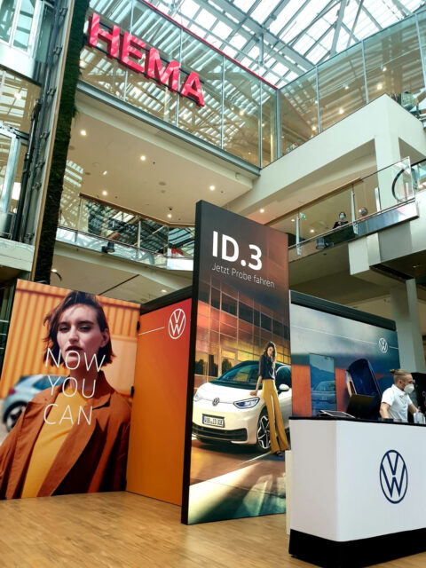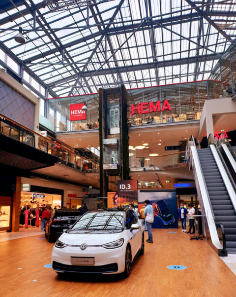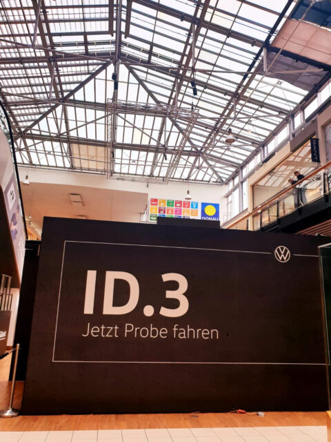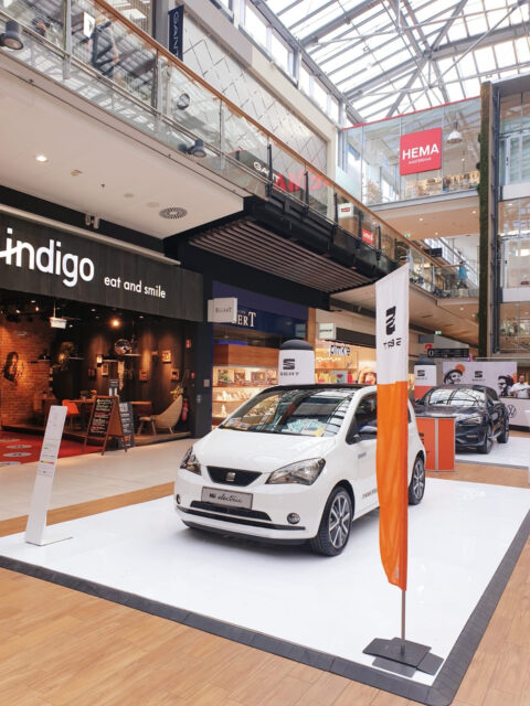 Die 190 Quadratmeter große, zentral an einem der am höchsten frequentierten Areale gelegene Eventfläche bot dafür die ideale Bühne. Nicht umsonst ist sie gefragte Station vieler Roadshows: Fast jeder der jährlich über 19 Millionen Besucher passiert den Bereich zwischen Eingang und Aufgang zum Obergeschoss. Das durch die Glaskuppel, das Markenzeichen der Mall, einfallende Licht leuchtete die eleganten Design-Details optimal aus. Und das einladende Ambiente im angesagten Industrial-Stil lud dazu ein, sich den VW ID.3 und den Seat Mii in aller Ruhe anzuschauen.