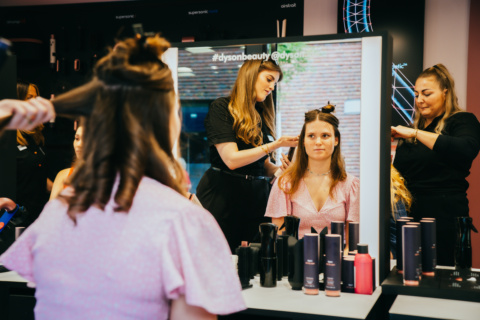 Situated prominently in the middle of Überseeplatz square, a glass pop-up module with modern styling stations all in the Dyson look exuded the charm of an exclusive salon offering visitors the full Dyson styling experience from quick hairdo refreshes and live demos to personal recommendations for every type of hair based on a professional hair “diagnosis”. Those who wanted to try it out for themselves were able to experience the power of the Supersonic r™ and the versatility of the Airwrap i.d.™, among other equipment. Of course, all Dyson styling products were also available to be purchased at the venue.